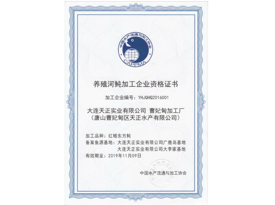 2017年3月6日,天正集團(tuán)獲中國水產(chǎn)流通與加工協(xié)會正式頒發(fā)《養(yǎng)殖河鲀加工企業(yè)資格證書》